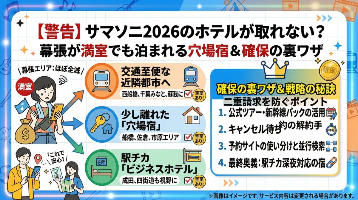 【警告】サマソニ2026のホテルが取れない?幕張が満室でも泊まれる穴場宿&確保の裏ワザ